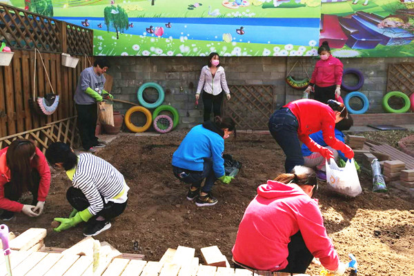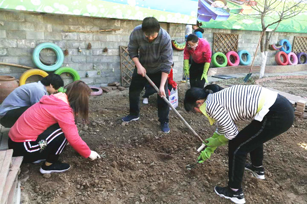 有的老师拿着铁锨翻地,将硬实的土地一点点铲松;有的老师捡琐碎的小石块;有的老师将石块重新排列堆砌整齐;还有的老师则是给土地进行追肥。一片欢声笑语中,大家互帮互助,干得是热火朝天,不一会儿,小花园就开始呈现出生机盎然、春意满满的景象。