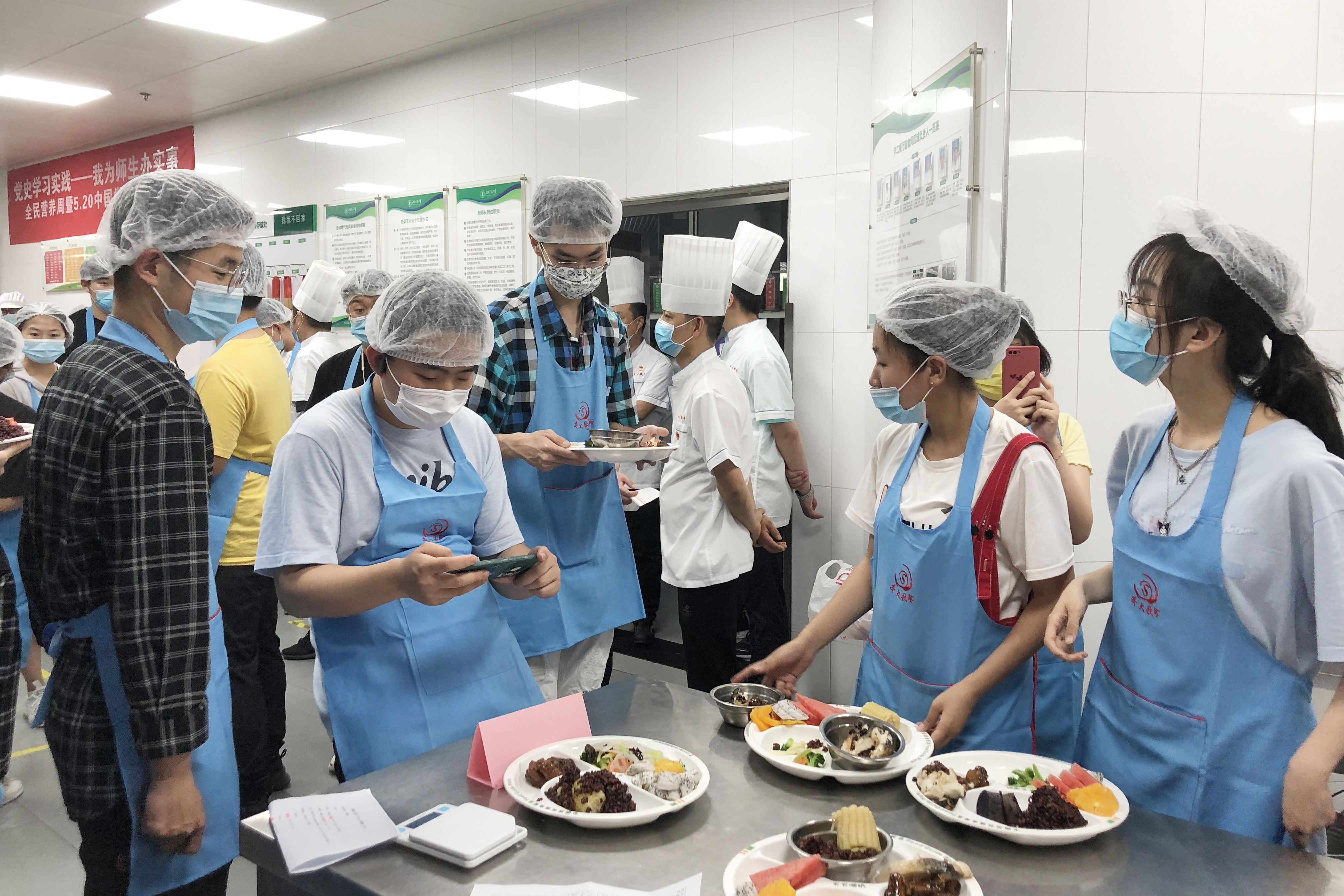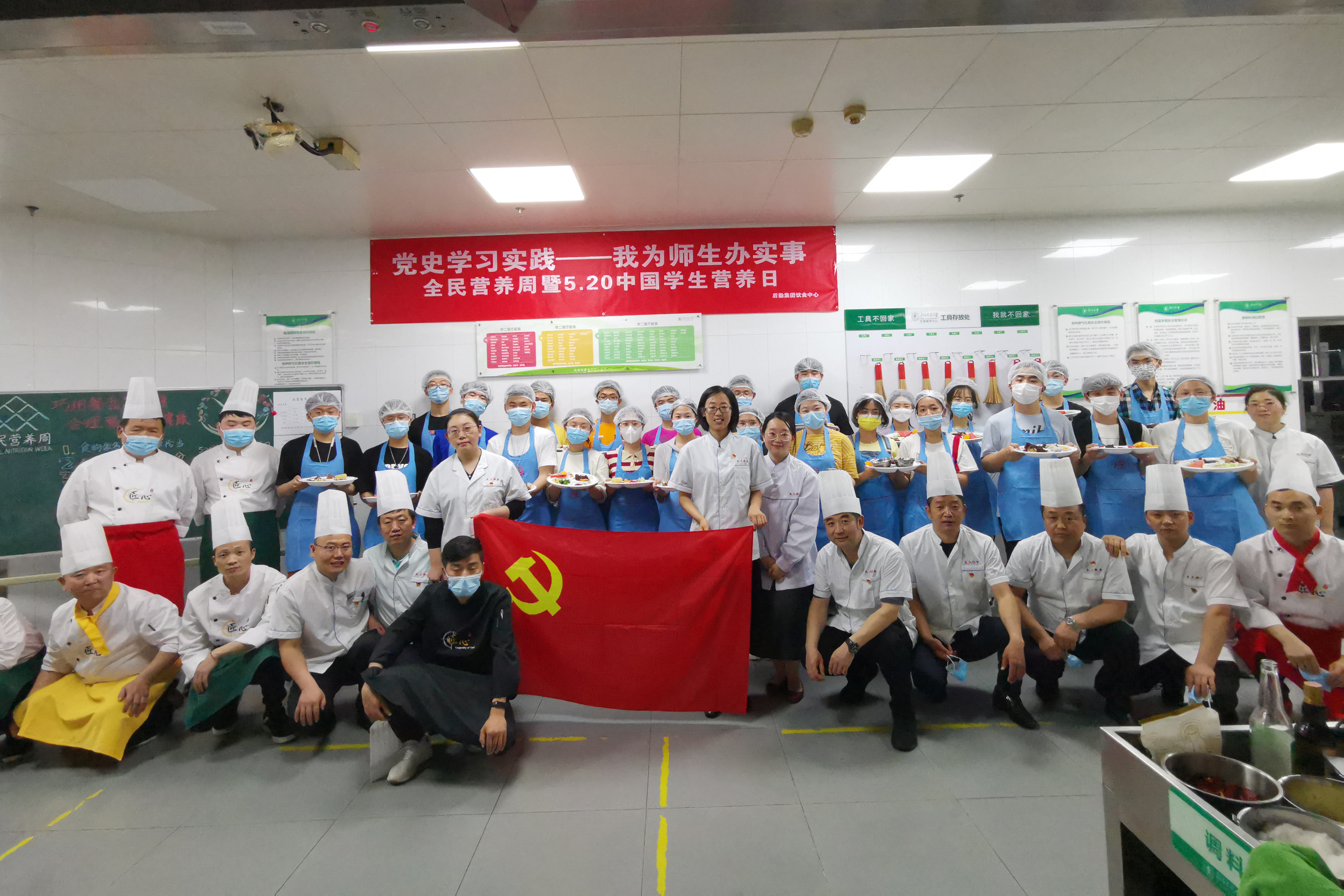 为提高学生营养健康意识,引导学生形成合理膳食的健康习惯,5月20日(中国学生营养日)下午,后勤集团饮食服务中心党支部将党史学习教育与党支部实际工作有机结合,与学生党员代表联合在学二餐厅开展“巧用餐盘算食谱,合理膳食享健康”主题活动。学生党员、中心党员及骨干厨师等50余人参加了此次活动。
