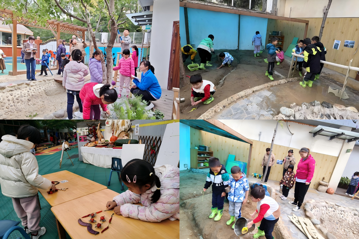 其中,我园名师工作站学员曹莉老师、骨干教师赵淼老师呈现的大四班“秋天里的小花园”探索教育活动,成为整场研讨的核心亮点:孩子们或手持自制工具穿梭于绿植间采摘果实,或在沙水区协作挖渠、模拟瀑布水流,或用积木搭建错落有致的拱桥,或用画笔勾勒秋日花园的鲜活图景。每一个游戏场景里,幼儿的自主性被充分尊重,创造力被尽情释放。而两位老师始终以“观察者”“支持者”的角色陪伴左右,精准捕捉幼儿的探索需求、及时回应成长困惑,将“以幼儿为中心”的教育理念转化为看得见、摸得着的教育实践。