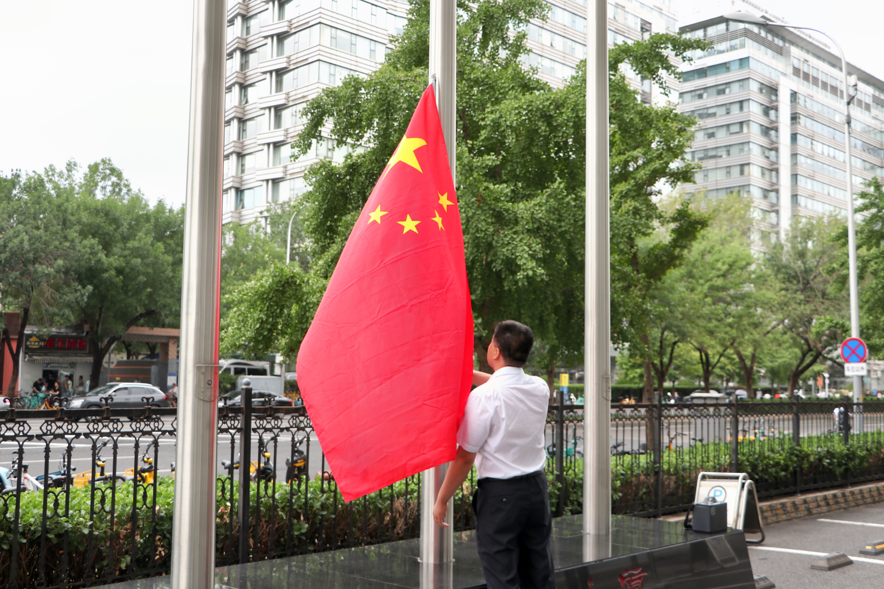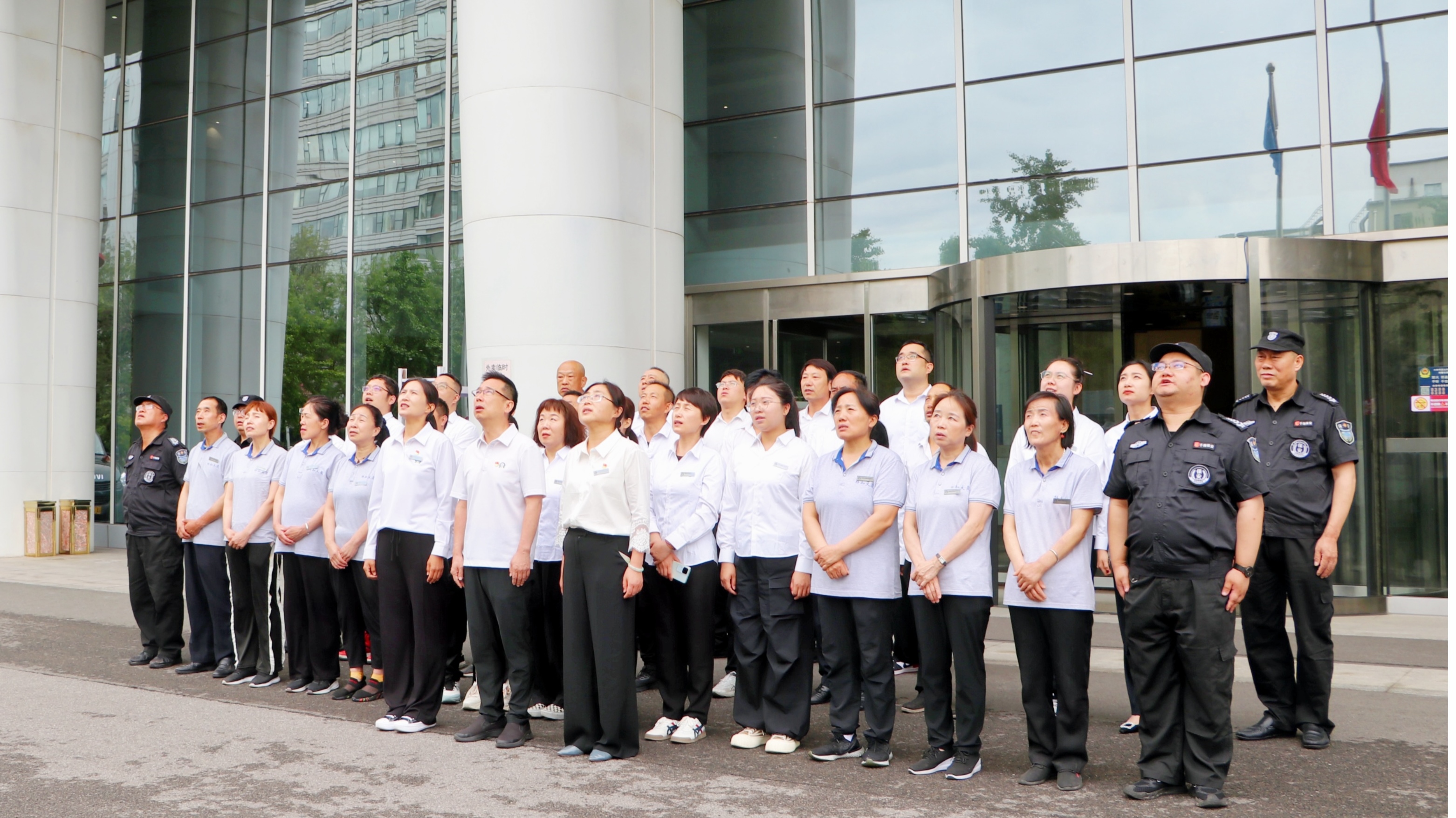 随后,升旗仪式正式开始,鲜艳的五星红旗在嘹亮的国歌声中徐徐上升,迎风飘扬,全体人员面向国旗整齐列队,奏唱国歌,表达对党的生日祝福。