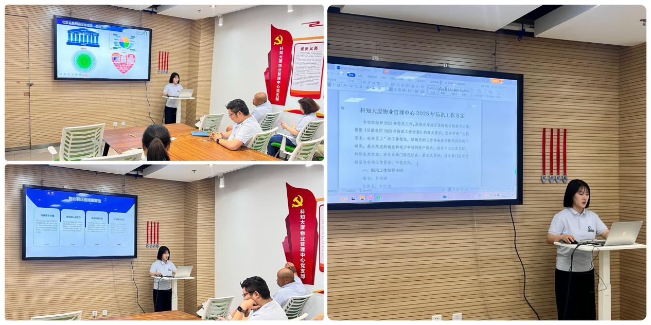 2025年6月25日,科知大厦物业管理中心组织全体员工开展了一场以“强化集团文化认同、深化职业道德建设、提升防汛应急能力”为主题的专项培训,旨在全面夯实后勤服务基础,筑牢汛期安全防线,为大厦安全运营提供坚实保障。