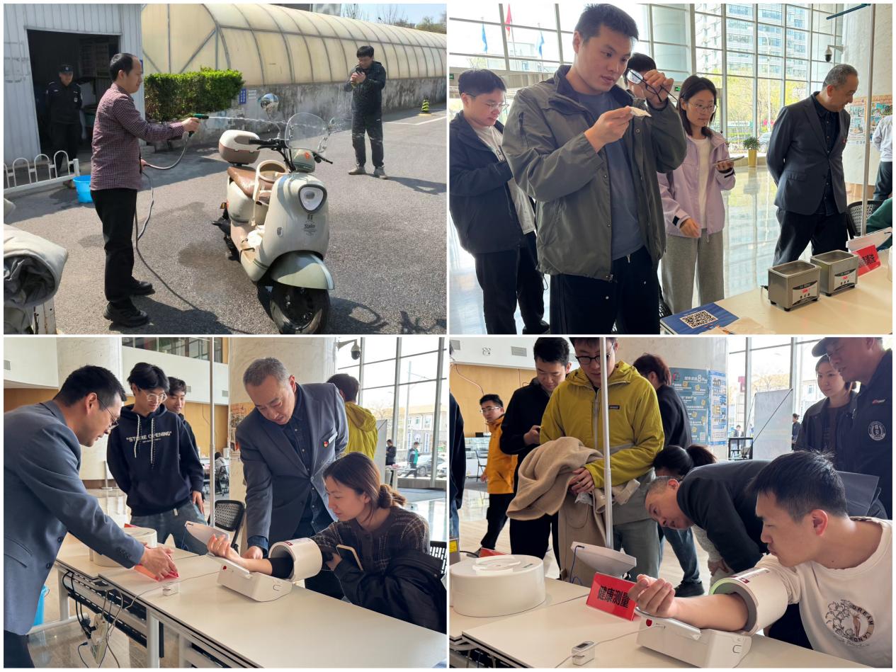 固定服务项目区人气旺盛,免费冲洗打气、眼镜清洁、健康检测等经典服务同步开展。中心工作人员为师生客户仔细清洗电动自行车,免费打气;专业洗眼镜设备助力客户清洁镜片,还原清晰视野;免费血压、血氧、身高体重检测服务,则为客户提供了基础健康参考,帮助大家关注自身的身体健康状况。