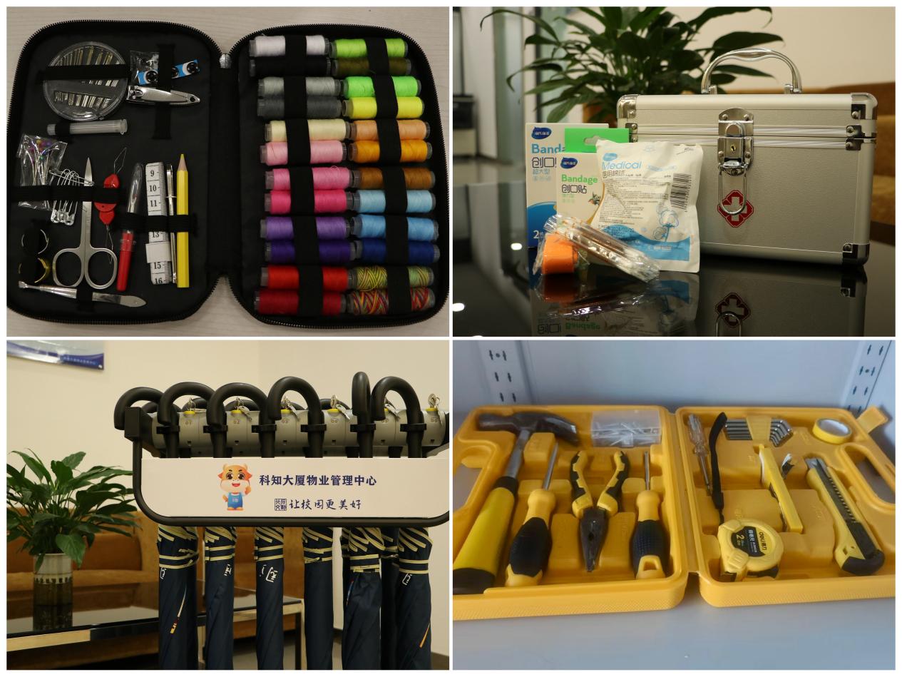 便民服务展示区全天开放,大厦前台“三包一伞”便民站始终待命。维修工具包、医疗急救包、针线包免费提供领用,雨伞租借服务随时响应,切实解决师生客户日常办公与出行中的各类小需求,将便民服务落到实处,让暖心服务无处不在。