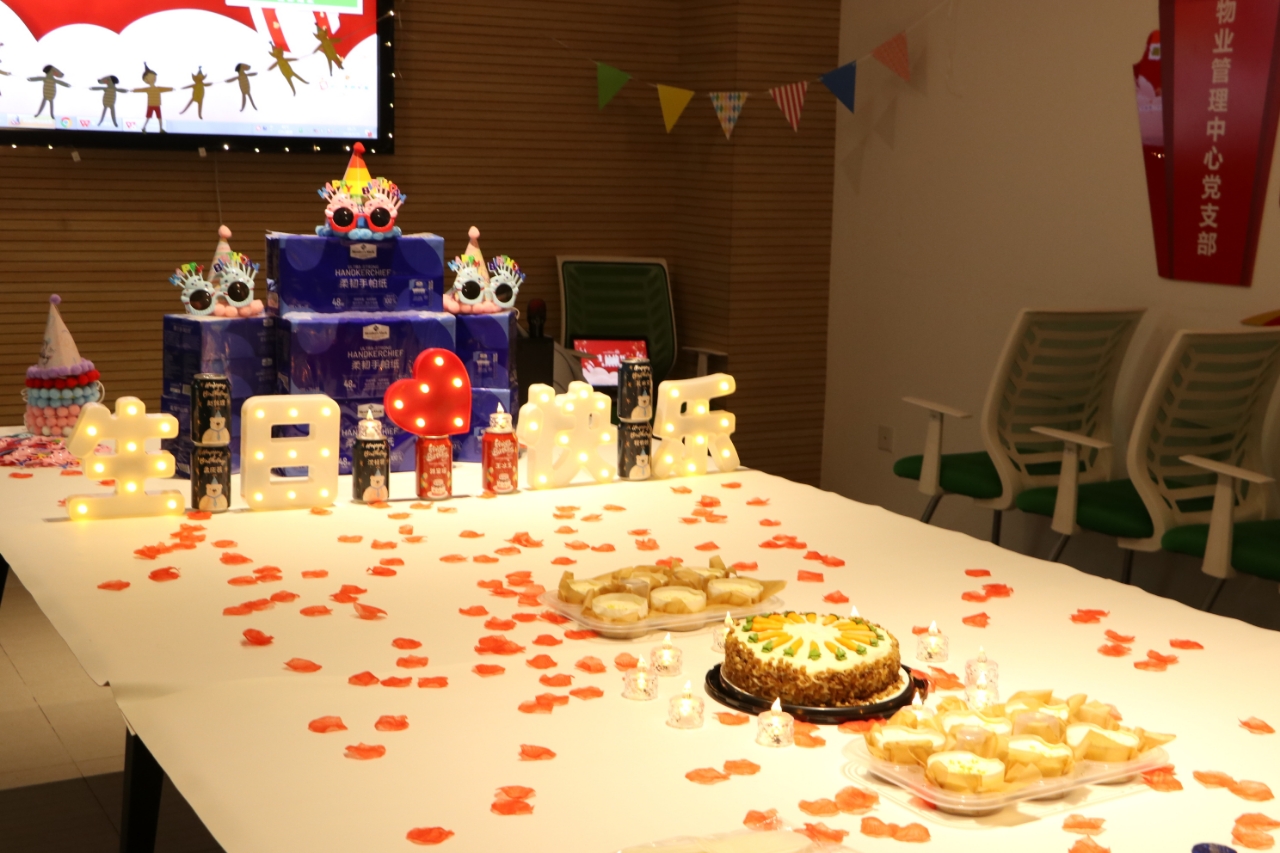 在生日会开始前,中心同事们为“寿星”精心布置了极具氛围感的生日会现场,中央摆放的精致蛋糕更是成为全场的焦点,不仅外观诱人,更蕴含着中心对员工的深深祝福。