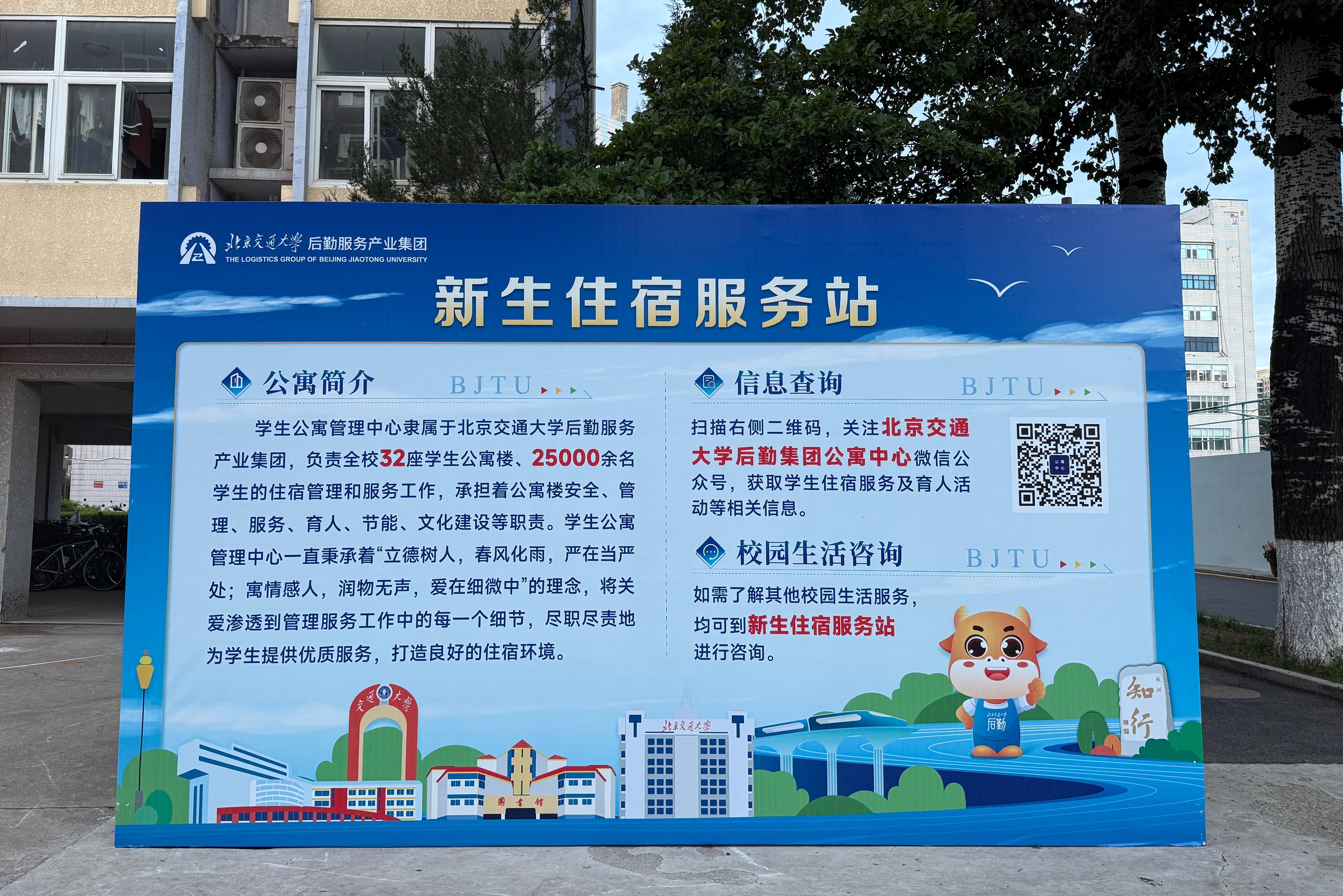 迎新当天,公寓中心在各公寓楼悬挂迎新横幅、祝福彩带等装饰,营造温馨氛围。中心同步提供多元服务——引导入住、解答咨询、卧具售卖、空调租赁等,流程衔接顺畅。同时通过电子大屏、广播、展板等,向新生普及反盗反诈知识,筑牢安全防线。