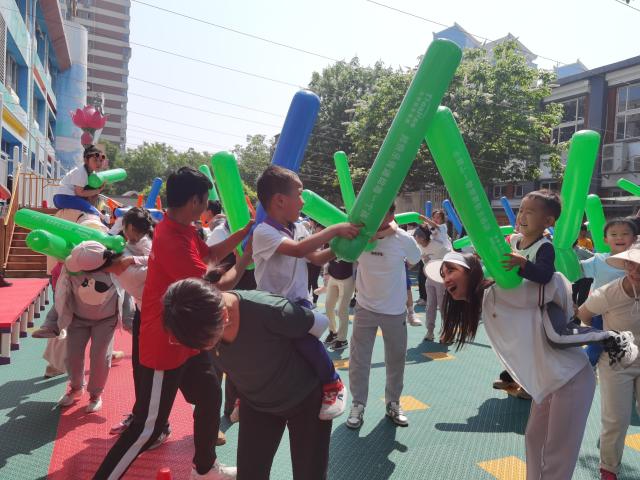 活动共分为五个环节:运动会开幕式、小运动员入场、幼儿健身操展示、主题游戏、舒缓放松。主题游戏是本次活动最大的亮点环节,游戏设计遵循各个年龄段幼儿的年龄特点,创设了不同的游戏内容,如“火箭升天”“小白兔大冒险”“钢铁战车”“翻山越岭”“太空漫步”“骑马打仗”等。小朋友和家长们在整个活动中沐浴着阳光,尽情地释放着自己的能量,共享着游戏的快乐。