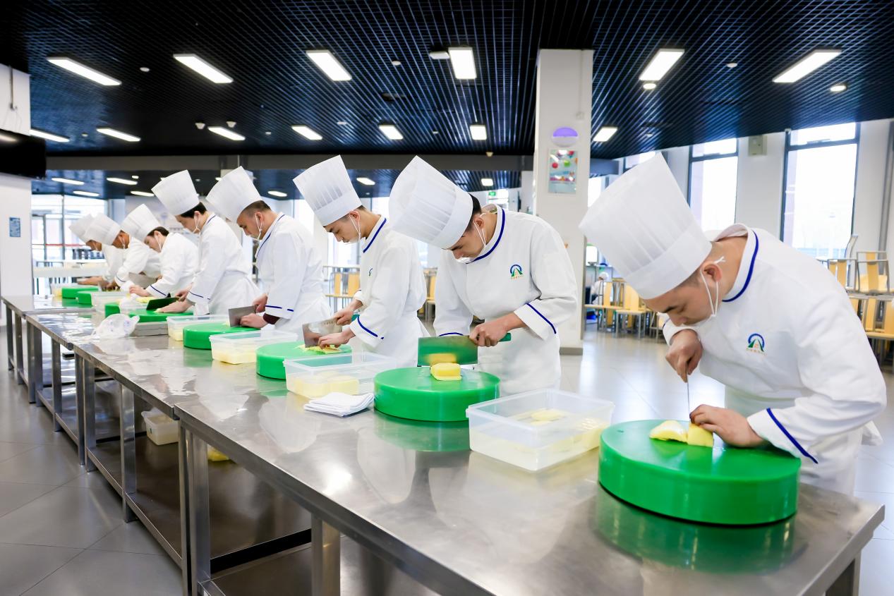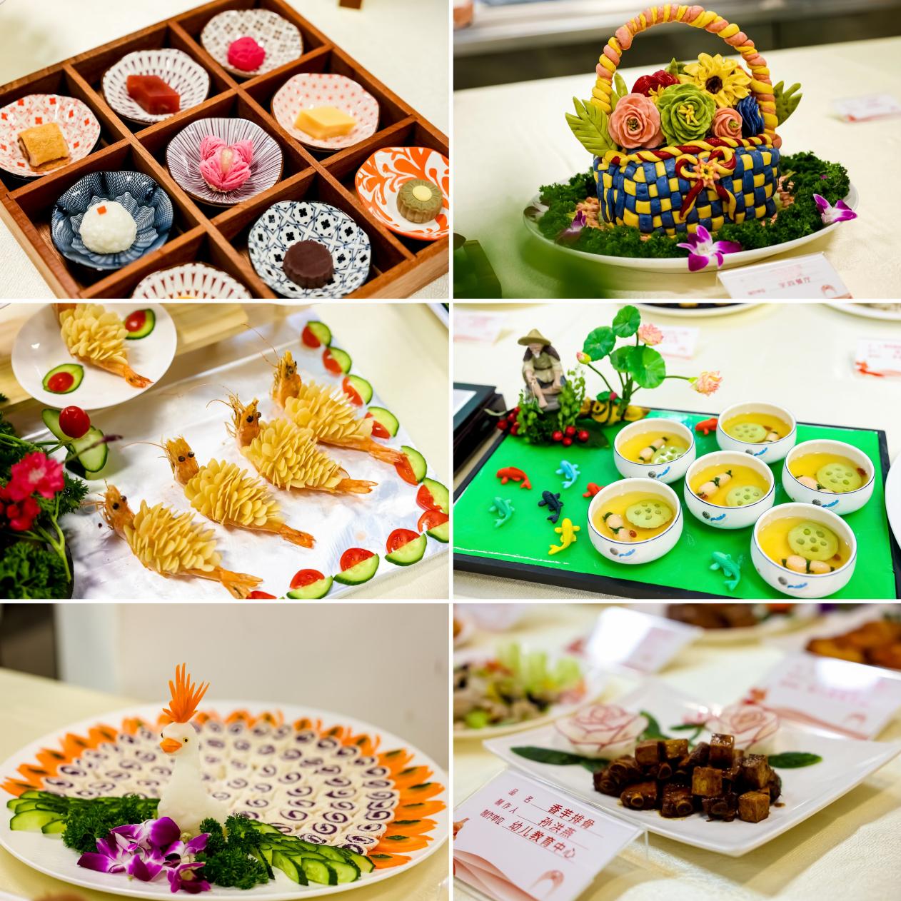 本届技能大赛共设置12大类15个比赛项目,涵盖消防、饮食、维修、值班、保洁、绿化等各个行业。其中,今天开展的饮食技能比赛分为刀工、红案、白案三个部分,全面考验“大师傅”们的切配、烹饪、面食制作、摆盘等专业技艺。在活动现场饮食服务中心、红果园学术交流中心、幼儿教育中心分别展示了精心制作的食品雕刻和美味佳肴。