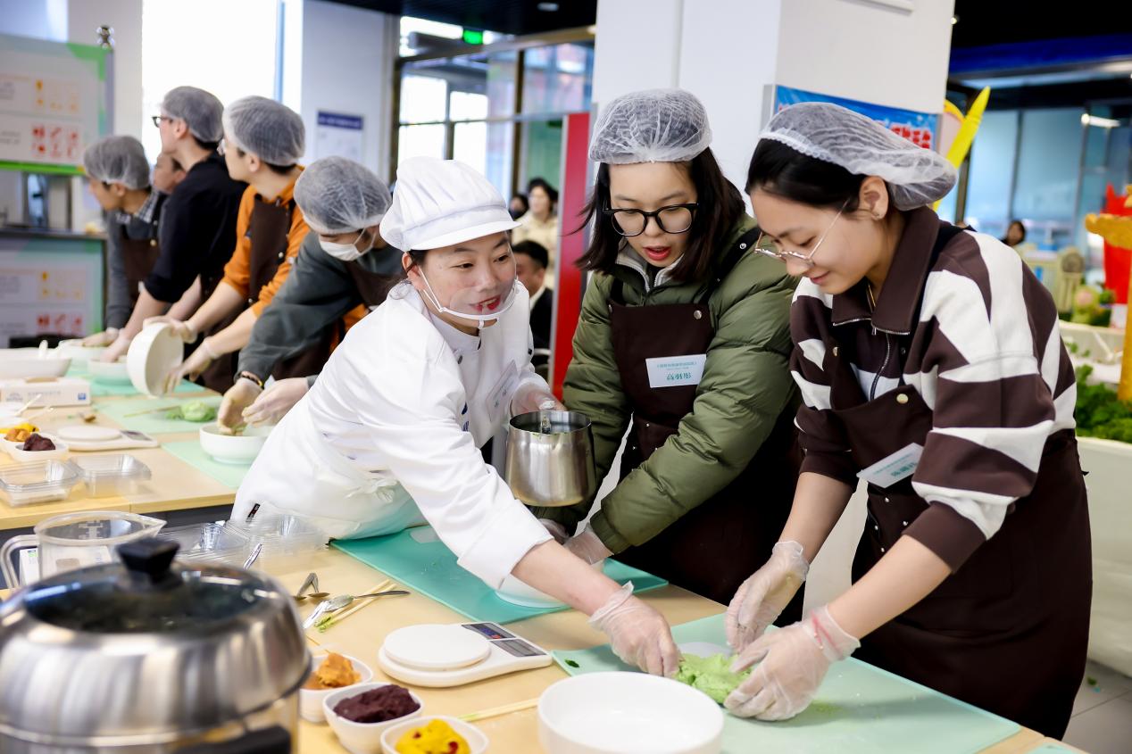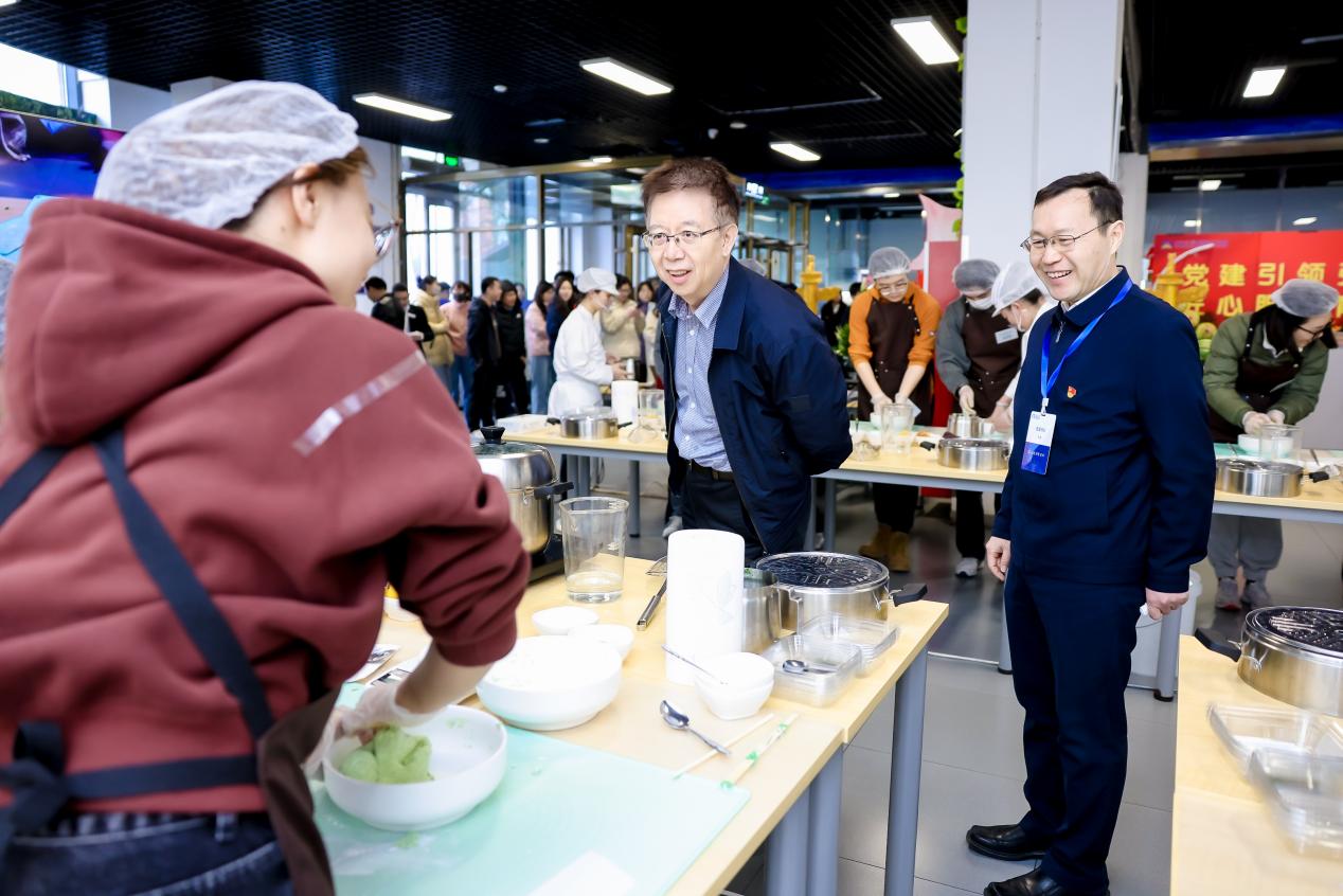 赵鹏现场观摩《营养与美食劳动实践》课程教学,与师生亲切交流。同学们展示现场学习制作的传统美食“青团”。