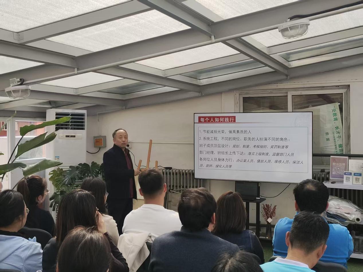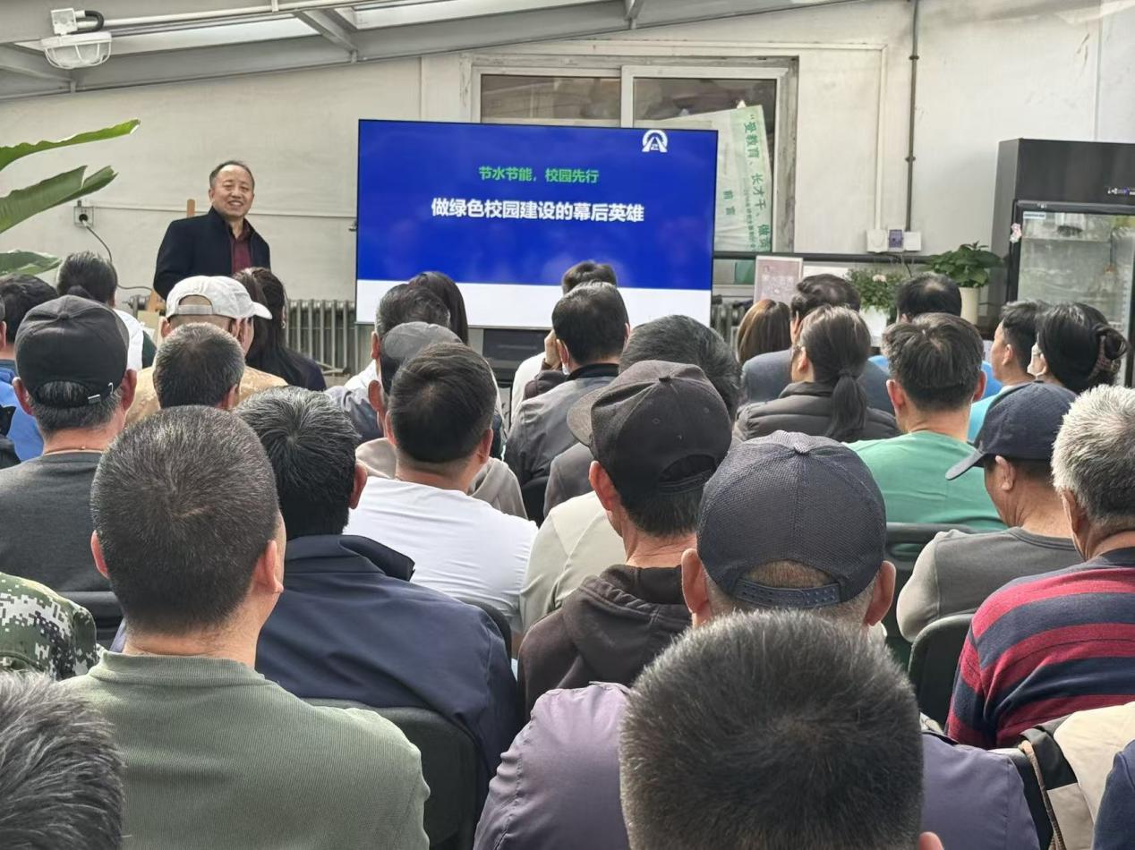 培训中,王海东主任紧扣国家“双碳”战略部署,结合北京市水资源紧缺现状,深入阐释了校园节水工作的重要意义,系统总结了学校荣获“全国城市节约用水先进单位”“北京市节约用水先进单位”的实践成果,全面展现了学校节水型校园建设的扎实成效。针对校园日常节水工作,王海东主任重点讲解了绿地科学灌溉、节水设施运维、中水处理及雨水回收利用等关键实操要点,并结合集团节能减排考核相关要求,引导全体人员将节水标准与责任融入日常服务细节。