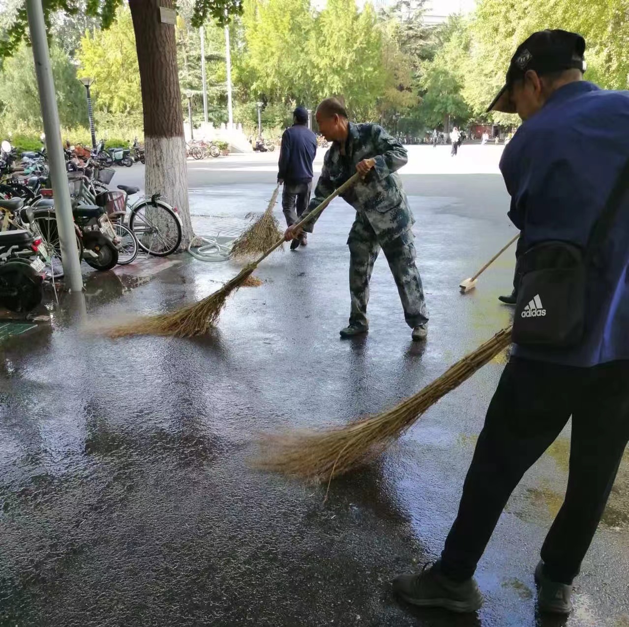 秋雨散尽晚霞至,整装校园迎友归。20日秋雨之后,对校园进行全面清扫,为返校校友提供干净、整洁、舒心的校园环境。在学校西门、南门设置欢迎校友返校的背景板、打卡板,受到广大校友的喜爱。校园内的一草一木,后勤人的一举一动,都彰显着对各位返校校友的热烈欢迎。