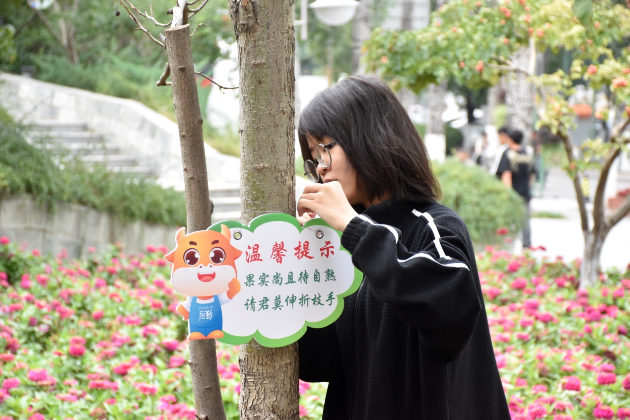 活动现场,两支部党员分工协作、默契配合。一部分党员负责为山楂树、柿子树悬挂果实保护牌,引导师生共同爱护校园果实;另一部分党员负责核桃树绑草把工作,按照“松紧适度、覆盖关键枝干”的操作标准,为核桃树缠绕草把——此举能有效诱捕潜藏的越冬害虫,从源头降低来年病虫害发生风险,为树木安全越冬奠定基础。劳动的同时,校园中心党支部党员还分享了绿植养护知识,学生党员积极参与实操,在互动中深化生态保护意识。