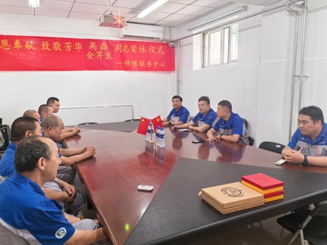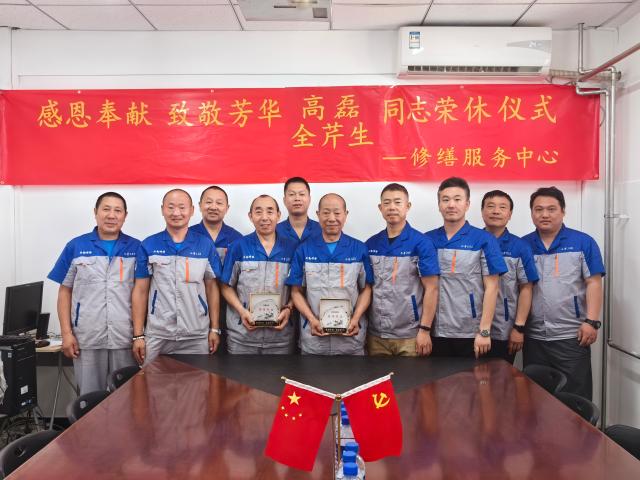 仪式上,大家一同观看了高磊和全芹生荣休纪念片,分享着在这特殊时刻的感悟。一帧帧画面,回溯着两位维修师傅光荣的维修生涯,也记录着来自这段最美时光里修缮中心全体人员对他们最真诚的祝愿。仪式中,中心领导对高磊和全芹生多年在中心维修工作中付出表示肯定和感谢,同时预祝两位同志退休生活愉快。其他同志也主动分享了与高磊和全芹生共事期间难忘往事和感触,表达了对老同志的不舍和祝福。仪式最后,为两位荣休职工颁发了纪念品并合影留念。