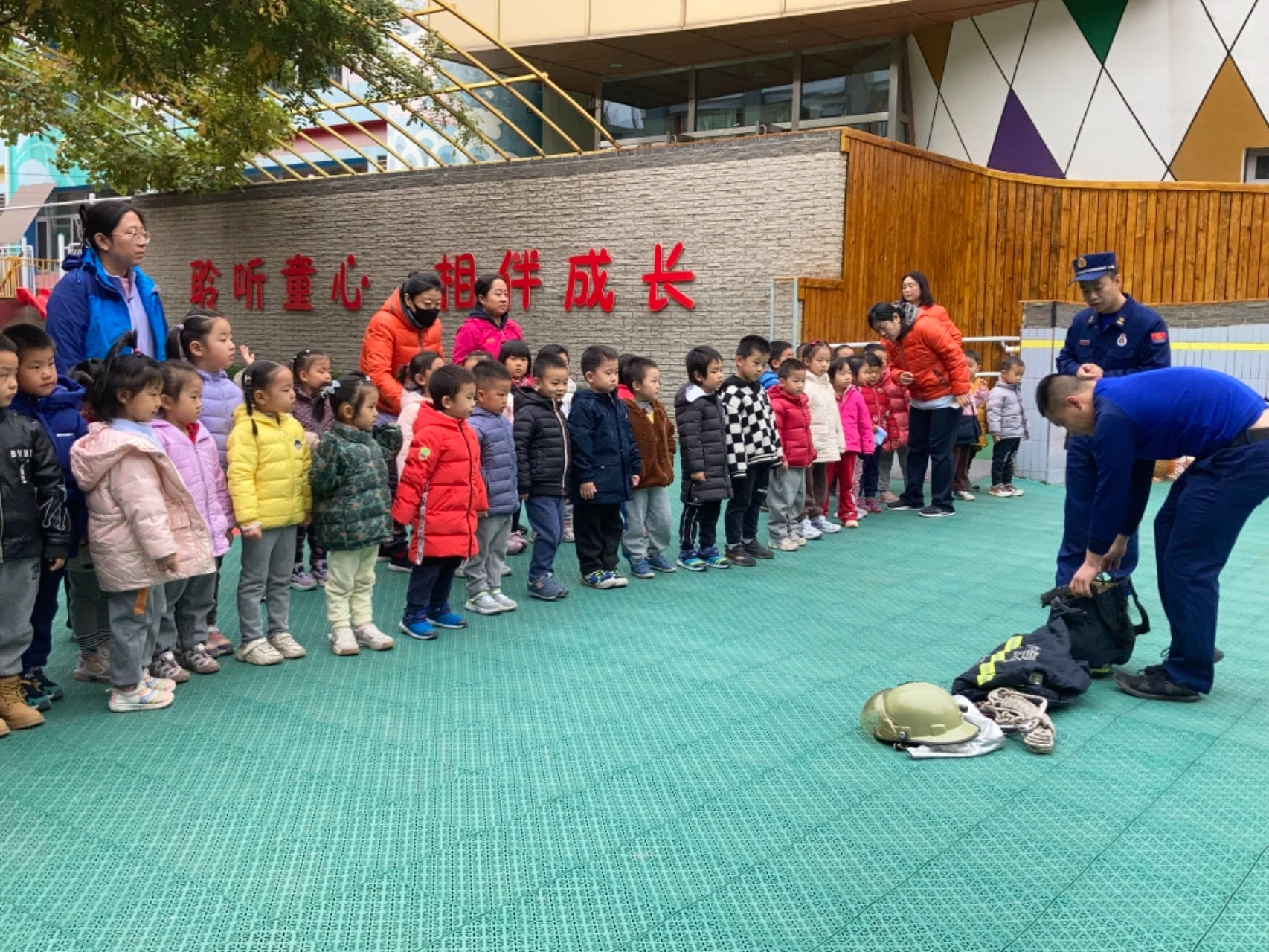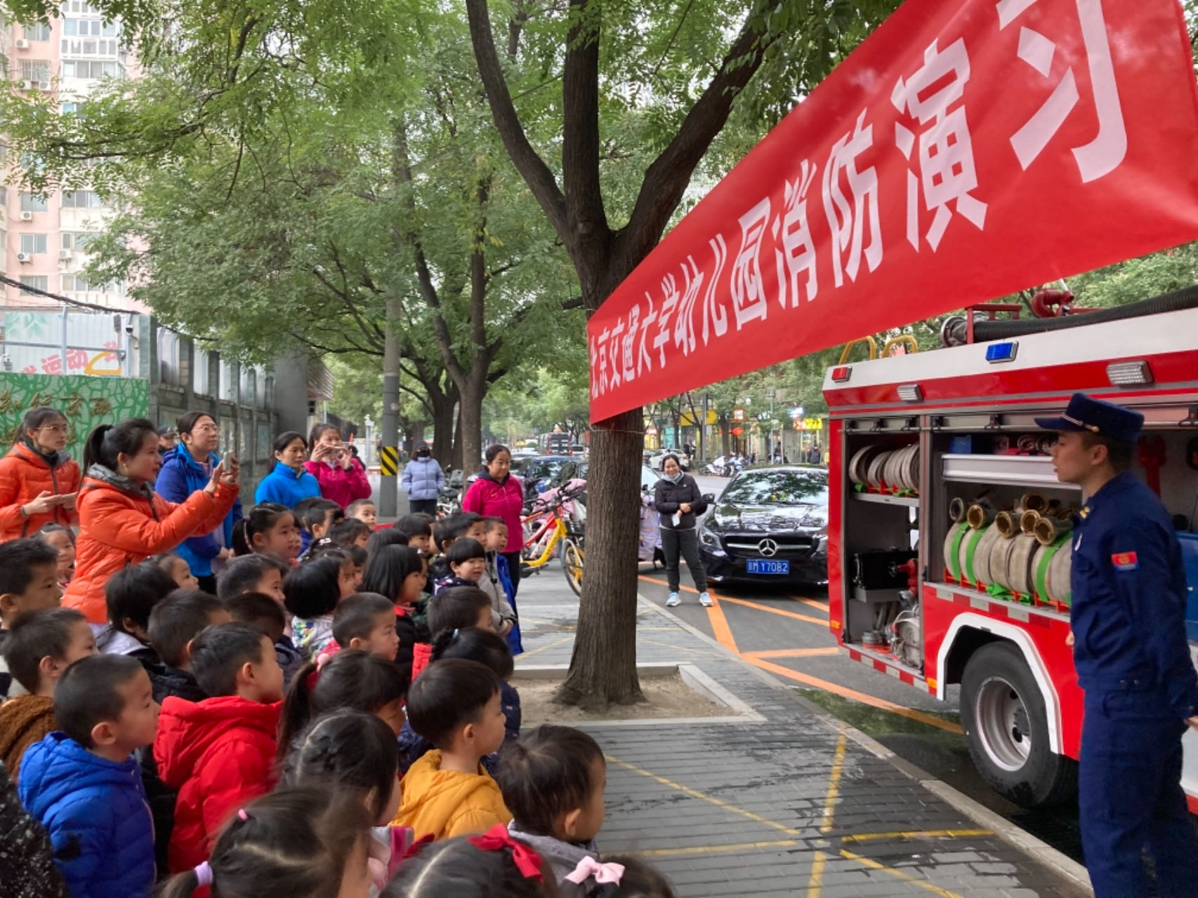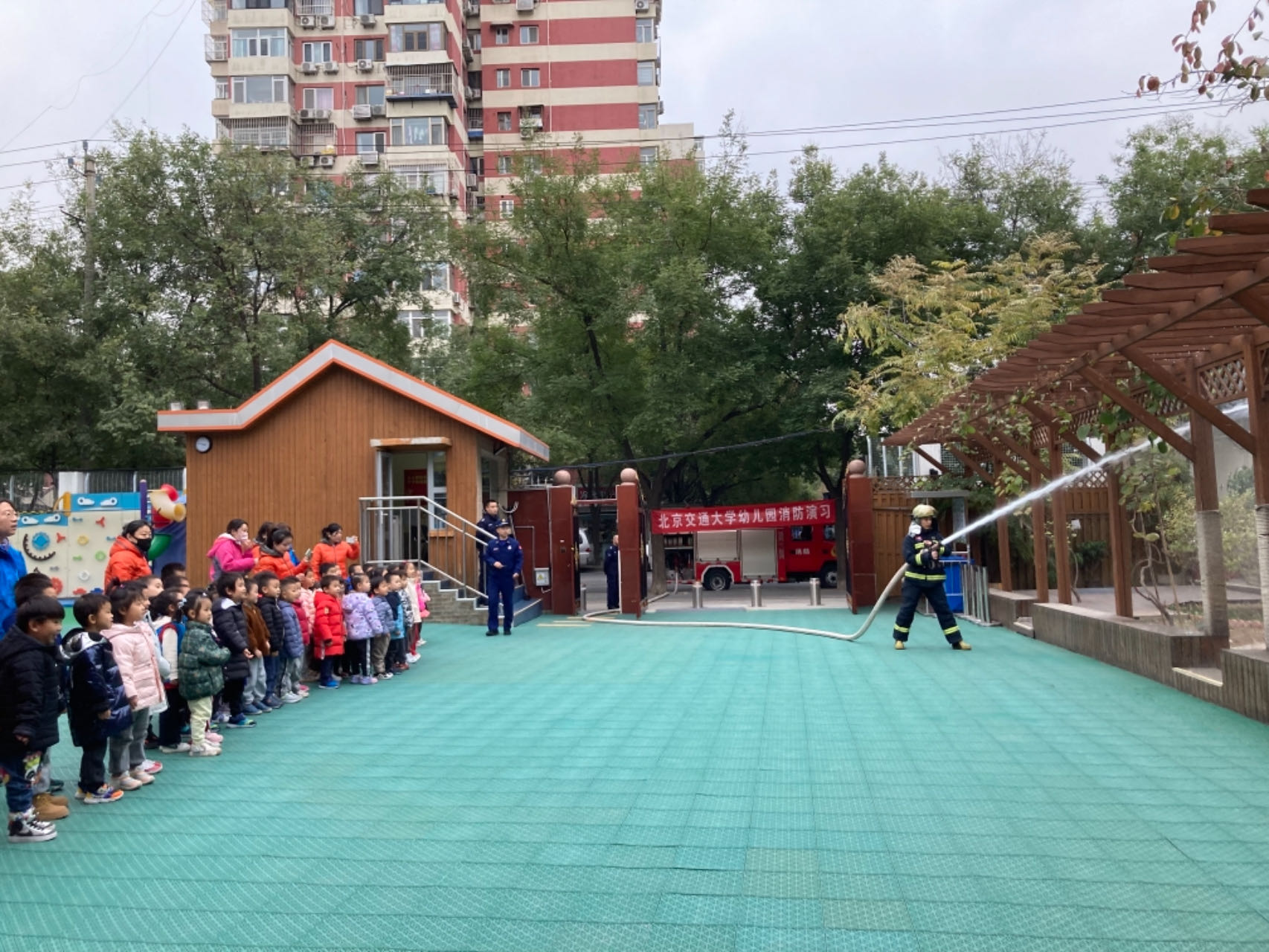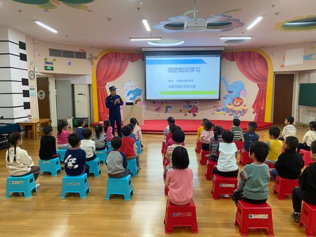 11月15日,在海淀区教育系统2023年度消防宣传月来临之际,北京交通大学幼儿园邀请双榆树中队消防官兵进园,为孩子们开展以“安全防范、守护健康”为主题的宣传教育活动。中班组三个班级的幼儿和带班老师参加了此次活动。