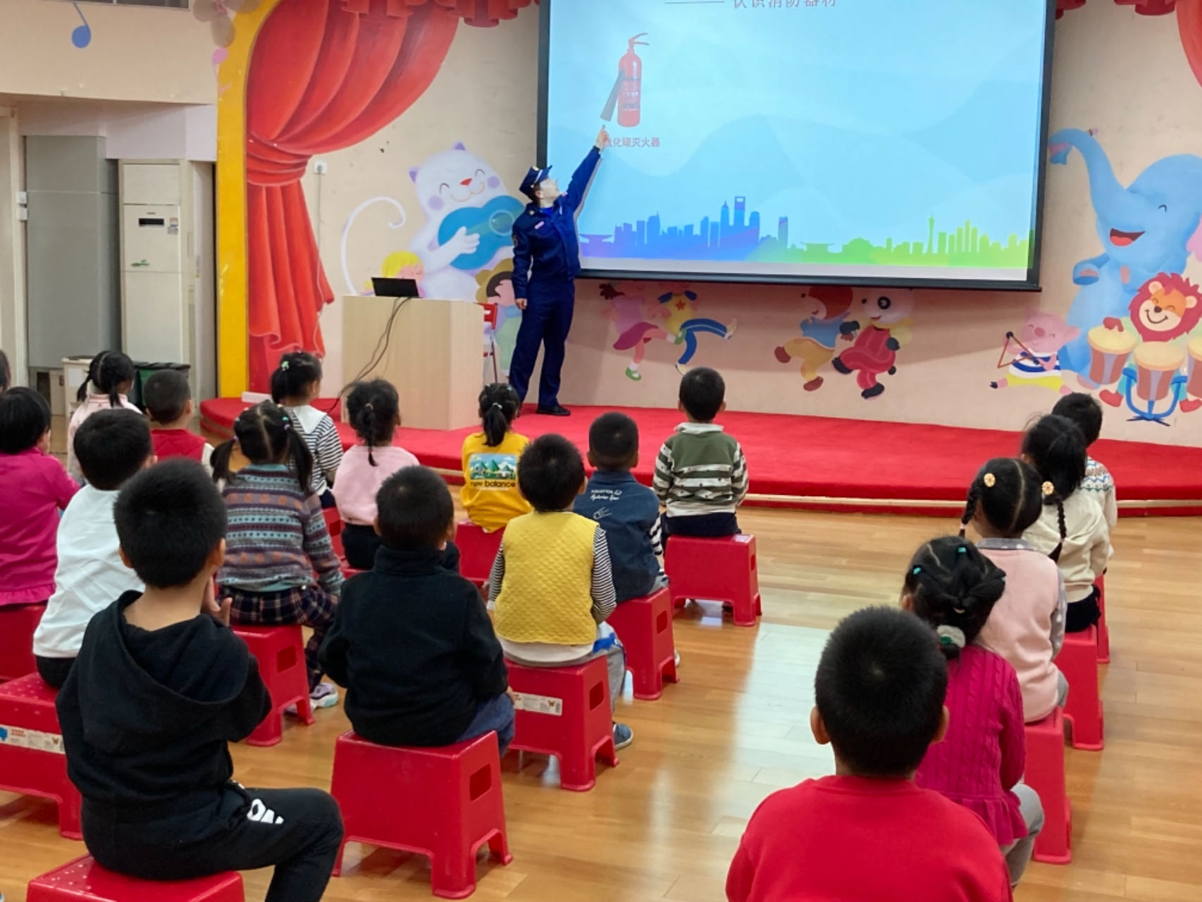 首先,双榆树中队教官严华东站长,通过视频播放、图片展示等形式,对幼儿进行消防安全知识教育。并生动的讲解了如何预防火灾及如何逃生。现场孩子们踊跃回答教官问题,积极互动,得到教官的鼓励和表扬。