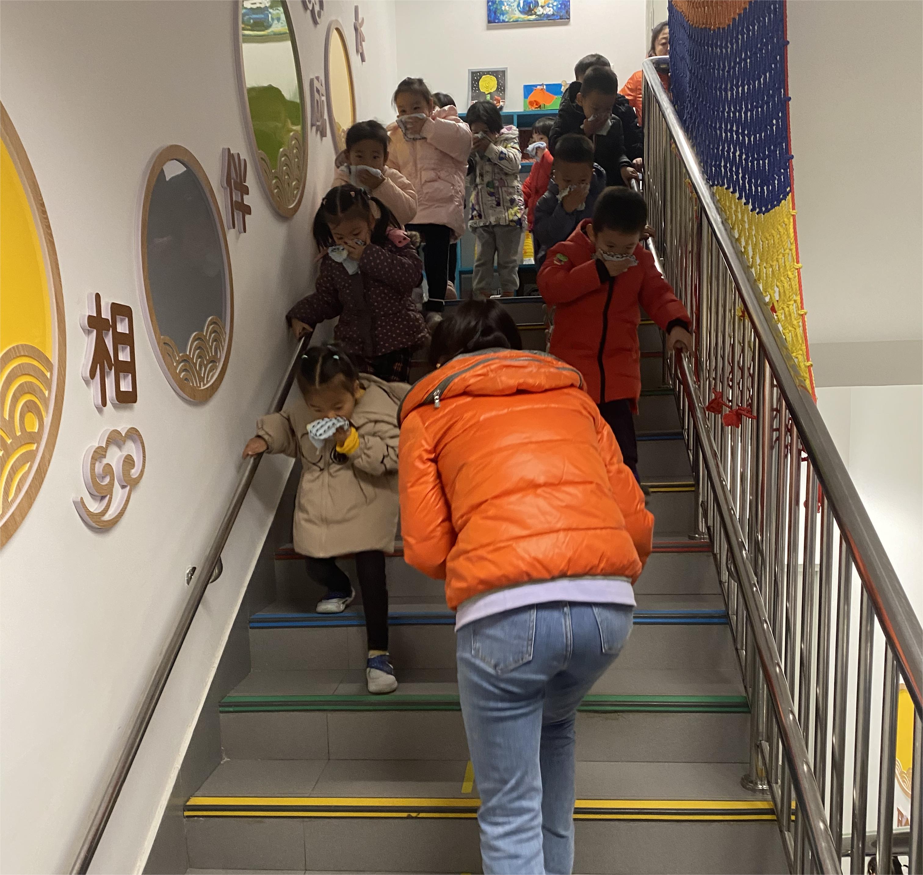 随后,消防官兵指导参加的全体师幼进行了消防逃生演习,现场情景模拟二层楼道玩具柜着火的场景情况。听到火警报警哨声,老师组织孩子用湿毛巾捂住口鼻,弯腰迅速沿逃生通道有序撤离到操场,各班老师清点幼儿人数并向主管安全园领导报告,整个疏散演练过程紧凑而有序。