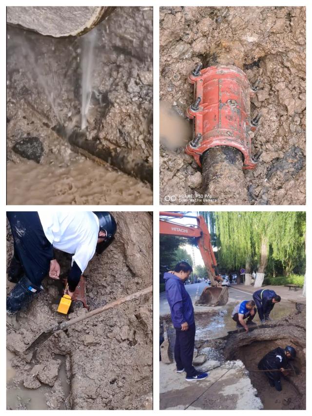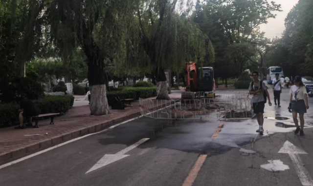 23日早8:30分,集团水电中心人员向修缮服务中心报修,发现明湖南侧路面积水异常。根据经验判断,地下水管漏水到地面,一般情况都是较严重的地下直埋管道跑水。我校作为国家节水型先进高校,拒绝水资源浪费,是后勤保障工作中的重要任务。修缮服务中心高度重视,立刻派出5名应急抢修人员勘察现场、寻找漏点。但该区域地下管线复杂,查找工作遇到了很大挑战。修缮服务中心协调出动大型挖掘机,路面连续开挖2个大面积探坑,才最终发现管径D80、埋深1.5米、负责3个重要校内建筑供水的问题管道。