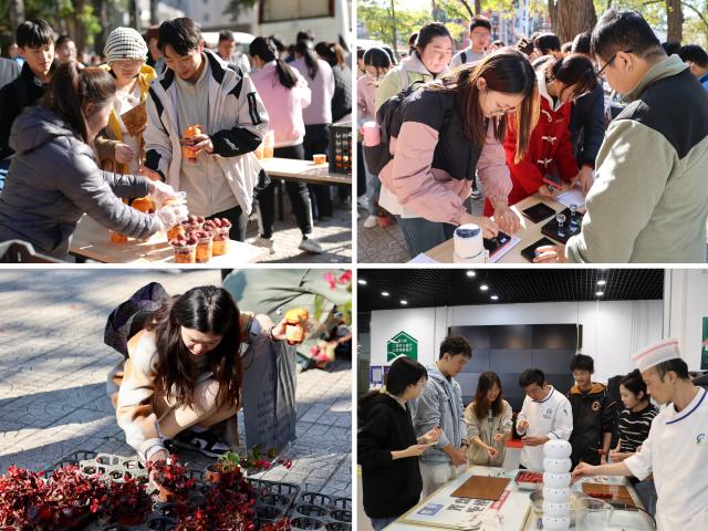 本次活动分为果实回馈、明信片集章、花卉免费换土、制作糖葫芦四部分。后勤集团在上周的劳动育人课上带领同学将校园内成熟的山楂、柿子采摘并用心包装,连同培育的部分海棠花一并赠送给到场的师生。这些果实成长在交大校园,不仅记录了全校师生和后勤集团的辛勤劳动,更承载着一份收获、健康和对美好生活的祝福。除了果实和花卉回馈,在活动现场还可以领取明信片,加盖校园文化特色印章,明信片上印有校园的果实和特色景观,深受师生们的喜爱,活动发放明信片近2000张。同时,绿化师傅们还为师生提供专业的换土服务和植物养护指导。此外,作为此次活动的系列项目,学二食堂师傅们指导同学们将采摘的山楂制作成糖葫芦,进一步分享收获的喜悦。
