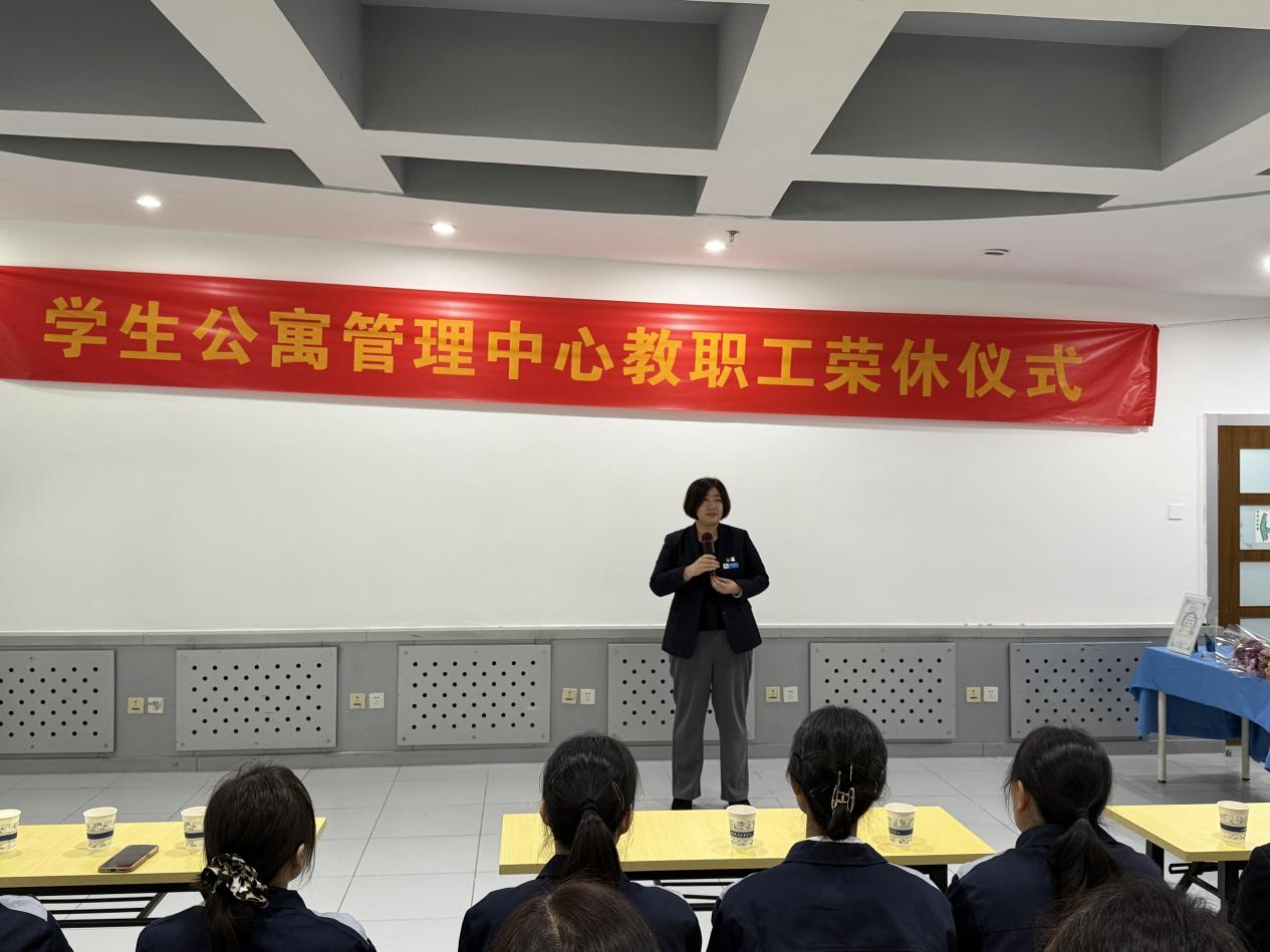 仪式在温暖的氛围中拉开帷幕,中心副主任田芳致辞。她代表中心向退休职工致以最真挚的感谢,高度肯定了他们为学生公寓管理中心做出的贡献。她深情回顾了退休职工们在各自的岗位上兢兢业业、恪尽职守的工作历程。无论是日常服务、应急处置,还是学生关怀、团队协作,他们的奉献精神都深深镌刻在学生公寓管理中心的发展历程中。