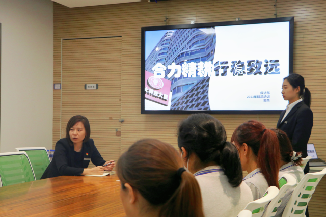 9月6日,科知大厦物业管理部在科技大厦B1会议室开展了年度精品培训系列课——第一课。本次课程以“合力精耕,行稳致远——保洁部工作规范”为主题,保洁部全体员工及各部门代表参加培训,保洁部负责人郭荣进行培训主讲。