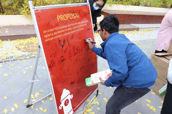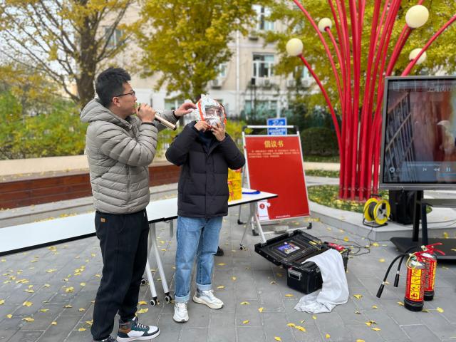 随着各公寓消防广播的开启,疏散逃生演练正式开启。同学们随着老师的指引自两侧消防通道有序撤离,将所住公寓的疏散逃生路线熟稔于心。随后由保卫处老师详细讲解了灭火器的使用方法、过滤式消防自救呼吸器的佩戴要点及疏散逃生时的注意事项,留学生们热情高涨,纷纷动手体验学习。最后,大家一同观看了近年来高校火灾案例并参与消防安全知识问答,签署防火倡议书,争取做到防火从自身做起。