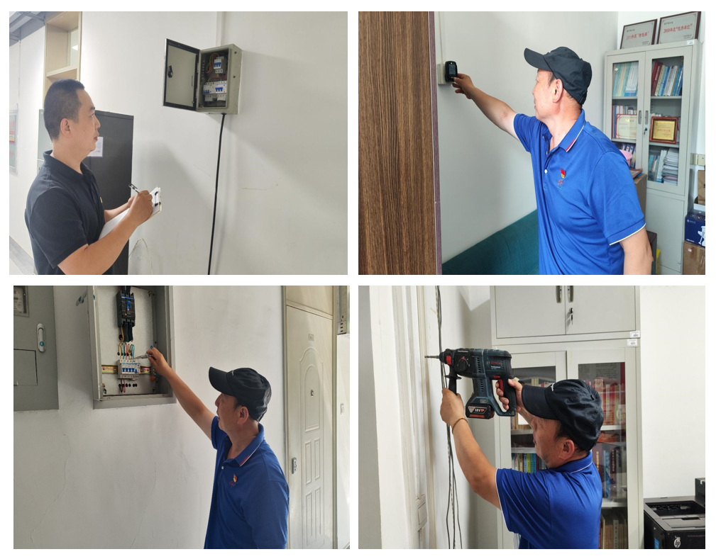 本次检查内容包括楼内公共区域配电箱开关运行状态、接线端子紧固情况、办公室插座电压范围、插座接地、室内强弱电布线规范等,大家认真测量了插座电压、接地及试验漏电开关动作情况,为办公室落漏网线加装了线槽板,并对配电箱内线路节点进行了紧固。