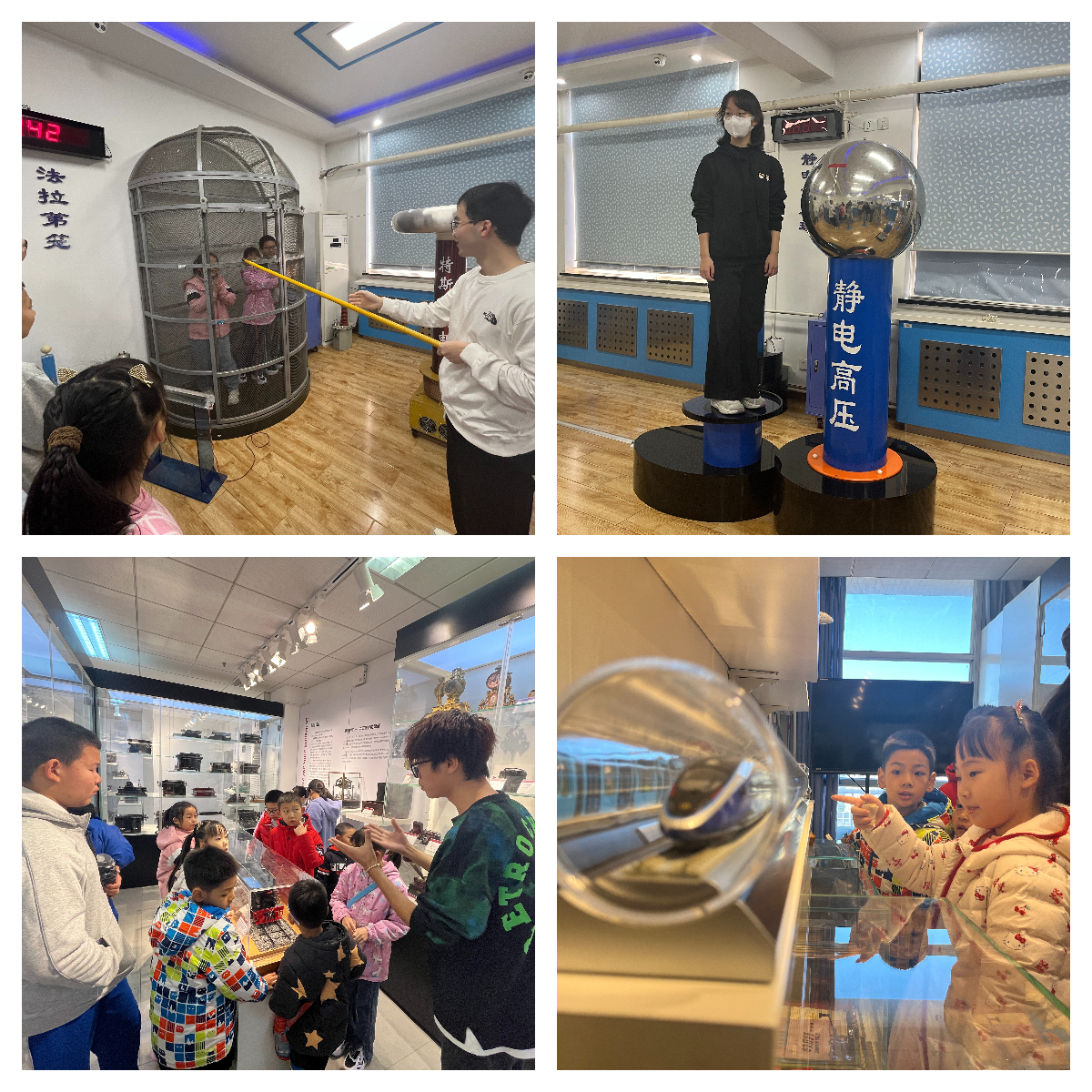 首先,同学们迎着明媚的朝阳,前往研学第一站物理实验室。在实验室中,他们近距离学习了科学的奥秘,体验了一些简单而有趣的物理实验,比如:法拉第笼的静电屏蔽、特斯拉线圈放电和静电高压。在实验室老师的指导下,同学们动手参与实验,真切地体会到了科学的魅力。