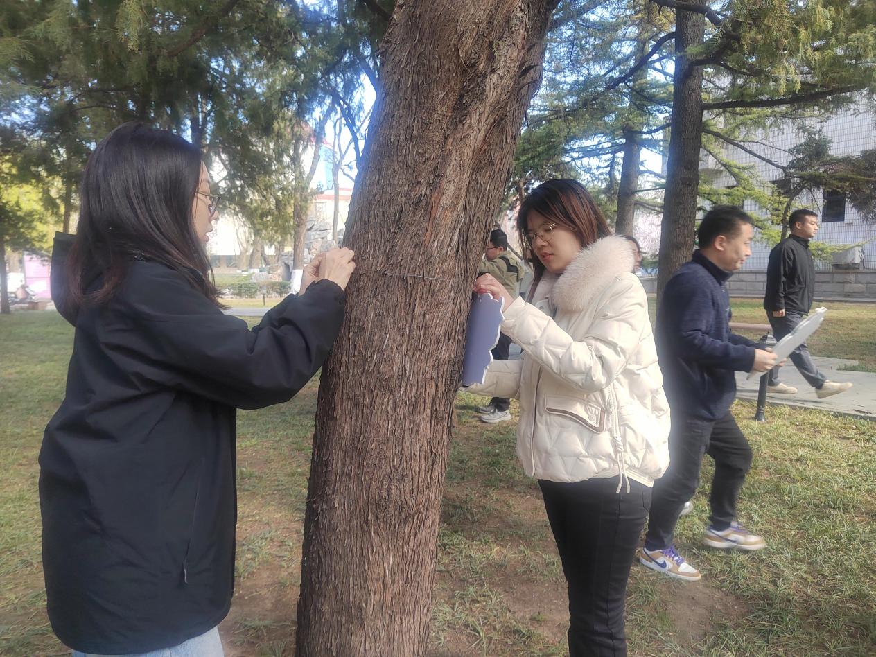 活动伊始,校园中心绿化技术相关同志向参与者科普了雄柏花粉作为春季主要过敏源的特性,并示范雌雄柏树的辨别技巧。随后,全体人员分组行动,在绿化技术人员指导下对明湖西侧雄柏进行系统排查,逐棵悬挂“标记牌”。经过一小时细致工作,成功完成区域内30余株雄柏的标识工作。